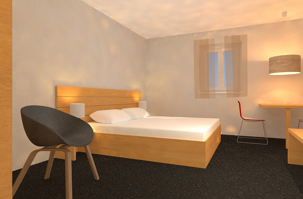 Einrichtung: Einzelzimmer mit eigener Dusche/WC: Doppelbett (2 x 90x180 cm) mit Bettwäsche, eigene Nasszelle (Dusche, WC), Wandtisch, 1 Stuhl, Sitzsack. Einbauschränke. WLAN, Sat-TV.