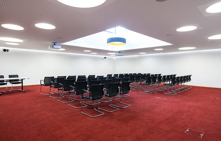 Der grosszügige Konferenzraum mit Foyer und zwei Eingängen ist ausgestattet mit zwei parallelen Beamer für doppelte oder unterschiedliche Anzeige sowie magnetischen Wänden.